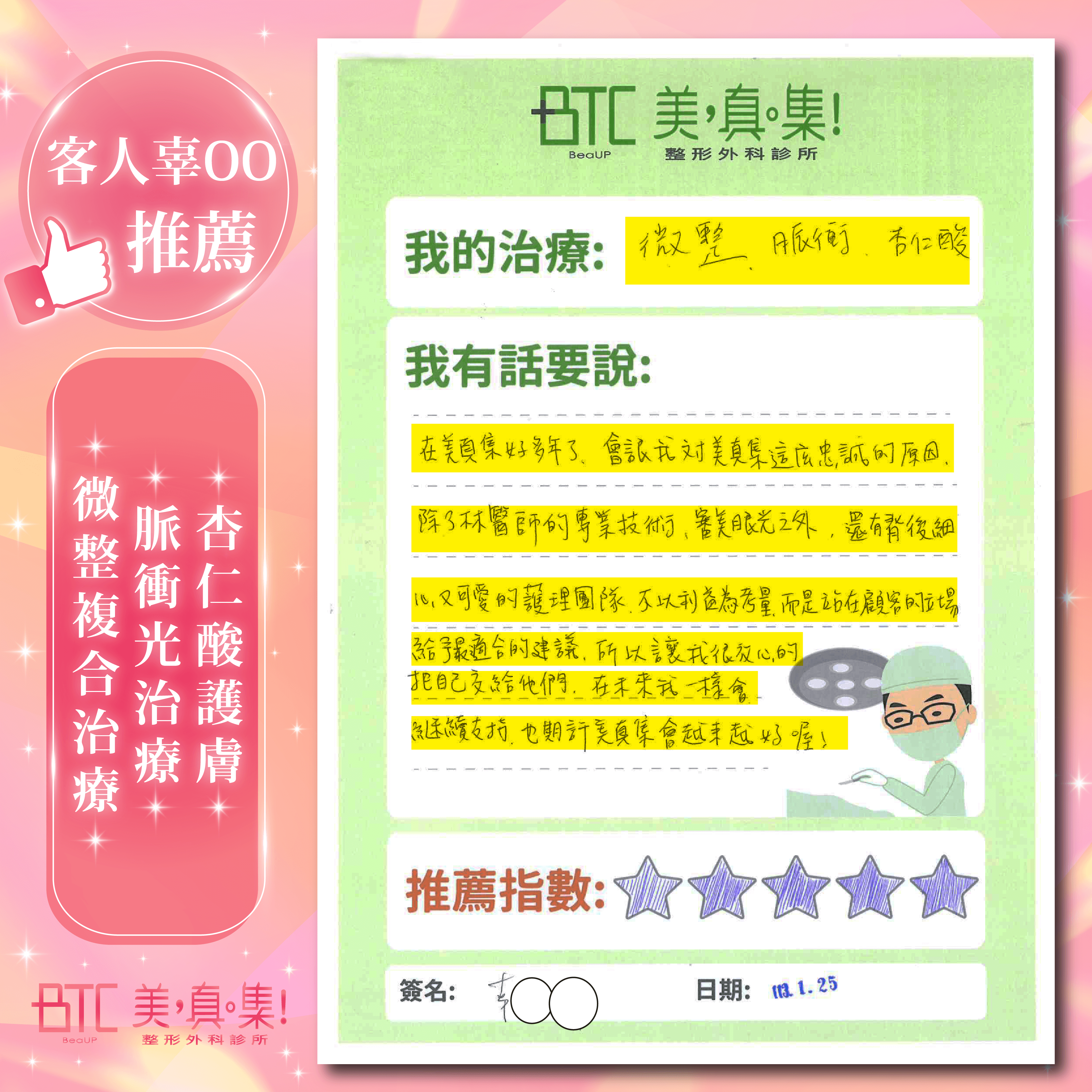 「在美真集好多年了,會讓我對美真集這麼忠誠的原因,除了林醫師的專業技術、審美眼光之外,還有背後細心又可愛的護理團隊,