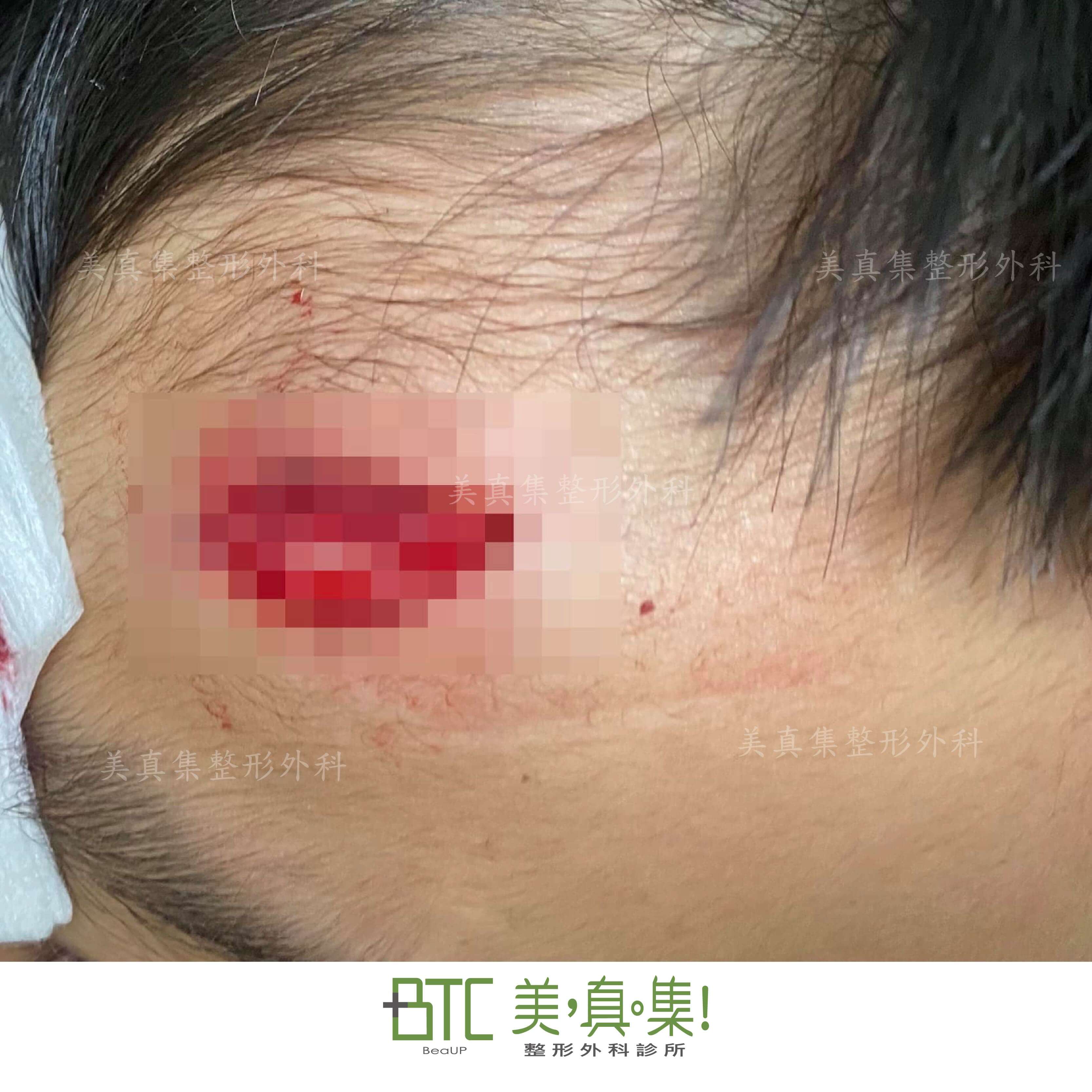 孩子的傷口很深,直見頭骨上的筋膜,開口超大,不斷的滲血,相信當下撞擊很大。