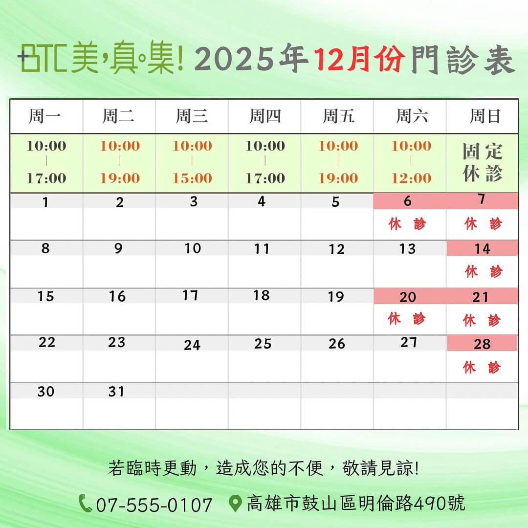 28 Total Views 美真集整形外科診所『2025-12月份』休診日如下: 🔸2025年 12 月休診🔸 ⁡ 美真集 12 月休診時間出來囉! ⁡ 若有臨時更改看診預約, 會將約診消息提前公告至粉絲專頁。 本診所為提高高品質醫療服務,為採預約制。如造成不便敬請見諒! #預約專線075550107 #高雄市鼓山區明倫路490號 -美麗預約專線- 07-5550107 -Line線上客服ID- 075362267 -Line線上客服一鍵加入好友- https://lin.ee/V65fZxq