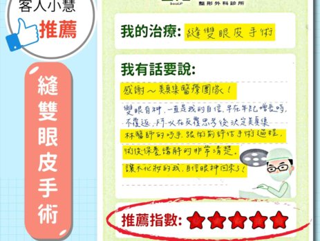 492 Total Views 客人小慧推薦:縫雙眼皮手術 感謝~美真集醫療團隊! 雙眼有神,一直是我的自信,早在年紀增長時,不覆返, 所以在反覆思考後決定美真集。 林明德醫師的巧手,跟術前評估到手術過程, 術後保養講解得非常清楚。 讓不化妝的我,自信眼神回來了! (閱讀全文…)