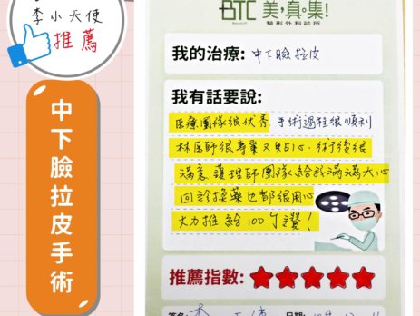 美真集客人李小天使推薦中下臉拉皮手術。(高雄整形/美真集整形/美真集醫美/拉皮手術/林明德醫師)