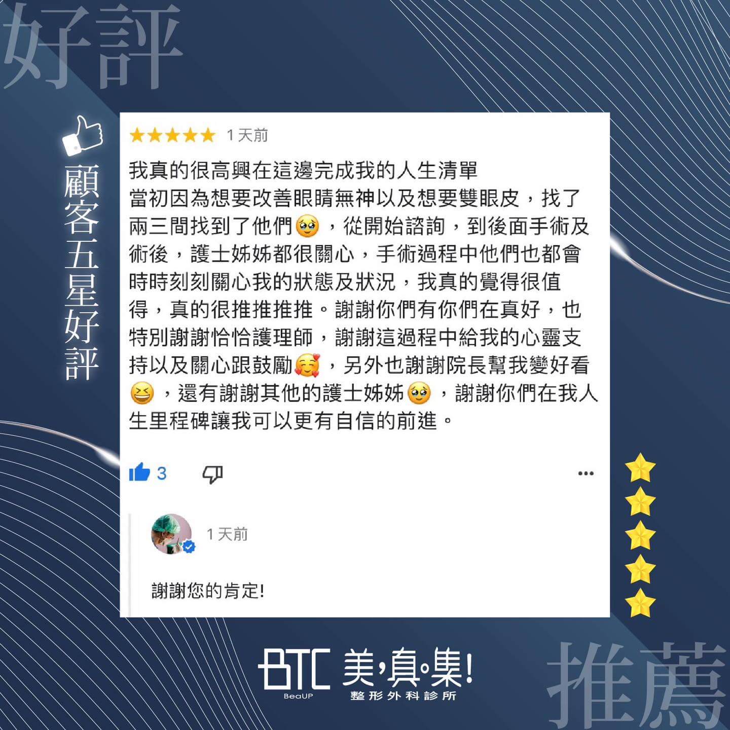 461 Total Views 感謝顧客的回饋 美真集用專業🎓服務❤️溫度🥰 創造適合您的自信雙眼 迎接屬於您人生的下一個里程碑 ▌最後小叮嚀 實際療效會依個人情形而有不同;以上資訊係做為診療的輔助說明、衛生教育及醫療知識分享,僅供參考; 而任何手術皆有風險,每人結構不同,恢復和結果皆不一樣。可能副作用請詳閱衛生局相關公告,請親自與醫師當面進行評估診斷後,再決定是否進行療程。 關於手術相關適應症、禁忌症、副作用、警語及醫療風險等醫療資訊請參考下方連結: https://reurl.cc/nZx06e https://reurl.cc/QWN3pq https://reurl.cc/Aygo5d https://reurl.cc/NGO666 https://reurl.cc/ymWgZD -美麗預約專線- 07-5550107 -Line線上客服ID- 075362267 -Line線上客服一鍵加入好友- http://line.me/ti/p/gSn4GkFMjw