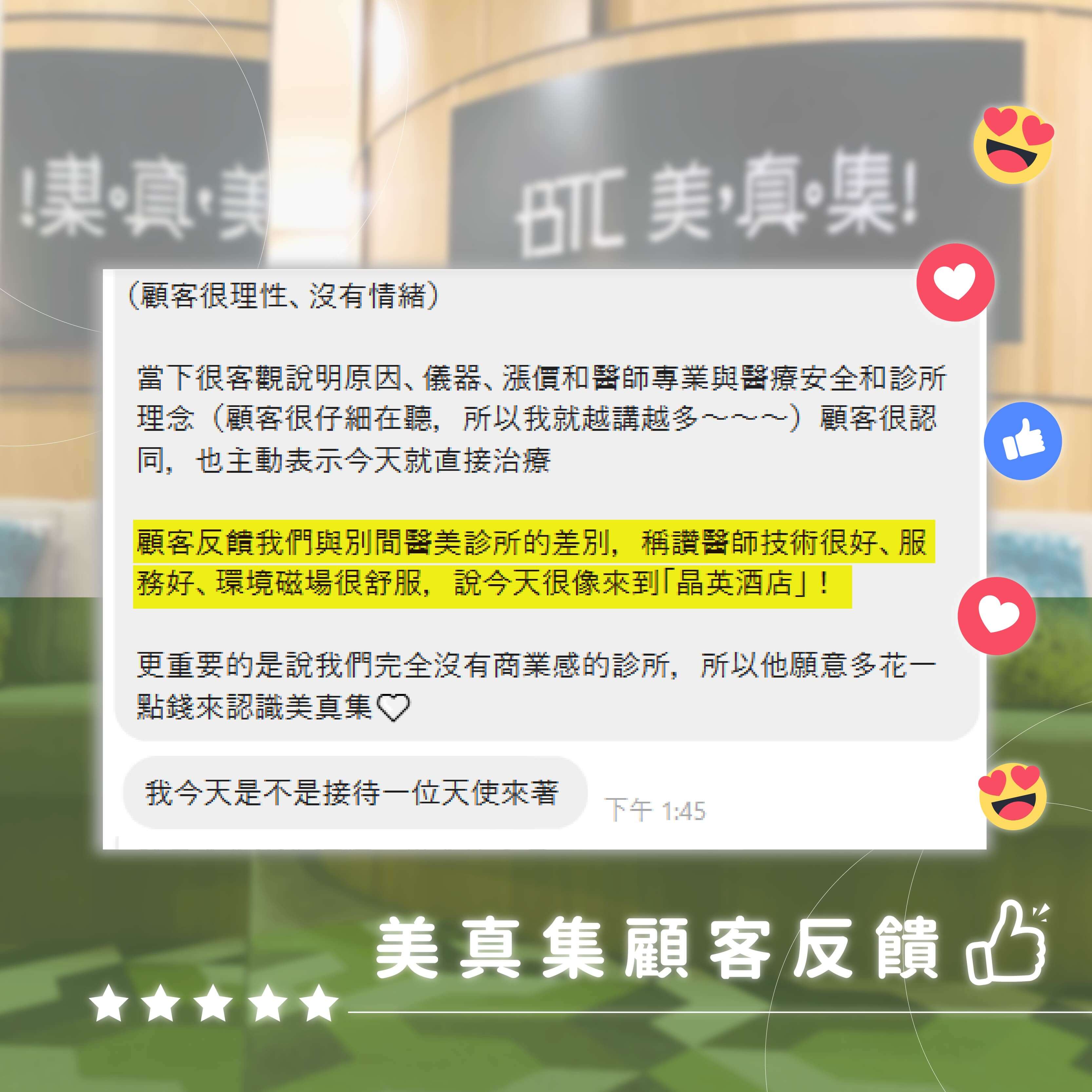 556 Total Views 「每次的粉刺處理皮膚保養及後續的脈衝光治療,讓我的皮膚越來越有光澤感, 也謝謝幾次的良好服務,讓我有個美好的體驗。」-這是來自顧客+000對美真集的好評回饋。 (閱讀全文…)